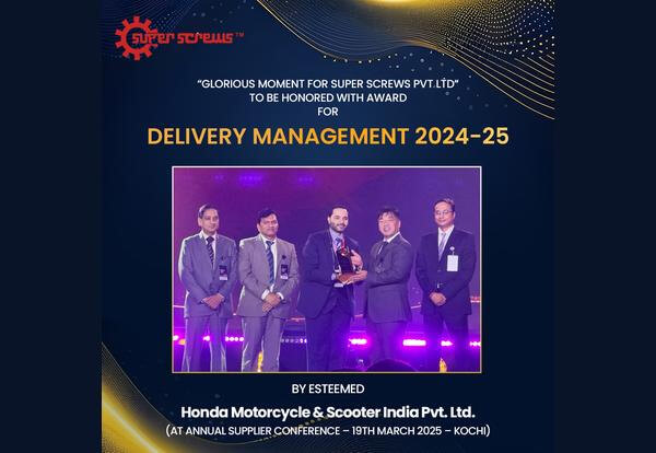 A moment of pride and excellence at HMSI Annual Supplier Convention 2025 ! Super Screws is honoured to receive prestigious recognition for Delivery Management from Honda Motorcycle and Scooter India Pvt Ltd for our commitment to precision, quality, and innovation. This achievement reflects our dedication to delivering high-performance fastening solutions that drive the industry forward.